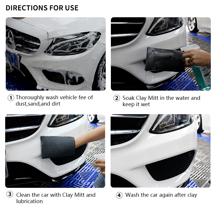 The clay mitts have the function of double-sided cleaning. The microfiber side can clean slight dirt on the surface. The clay side has strong viscosity, which can strongly and quickly remove most pollutants (oxidation, bug and tar, iron powder, rust spots, debris, pollen, acid rain, and asphalt) and make your car look new.