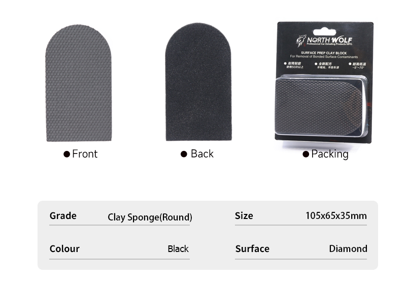 Manufactured with a high-tech rubber polymerized face, clay Sponge removes bonded contaminants in half the time it takes a traditional detailing clay bar.